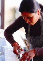 サビナさん(左写真の中央) サンギータさん(右写真) 彼女の母親は、誰よりも早くコットンクラフトに出勤し、 1年半前に出産をし、昨年職場復帰しました。 掃除をしてから仕事をし、サビナさんを育ててきました。 彼女は子育てと仕事を両立させて頑張っています。 今サビナさんは、カレッジに通いながら、コットンクラフトで 「女性が働き続けるには家族の理解と協力がないととても 会計や生産工程の管理をし、重要な役割を担っています。 難しいのですが、セービングファンドのことを夫や家族に伝えたら、 皆、自分よりも年下のサビナさんのことを信頼し、 皆とても喜んで、それからは仕事も応援してくれるようになりました」 プライベートなことも何でも相談するそうです。 元々は、「秘密の預金」として、家族にあてにされないように 「セービングファンドが始まってから、皆前よりも熱心に 誰にも言わない、という約束で始めたのですが、 仕事をするようになり、商品の質も量も向上しました。 サンギータさんのようなケースは多く、 遅刻もなくなりました!勤務態度がいいと、 思わぬ効果を発揮していることが分かりました。 ボーナスの際に評価してもらえるので。 仕事にはチームワークが必要です。一人では何もできなくても、 皆で力を合わせ、チームで仕事をすると、 大きな力になります。チームワークが良くなったので、 とても仕事がしやすくなりました」