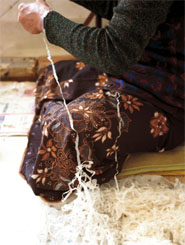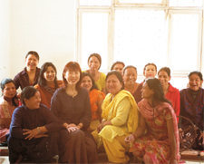 ネパールのロクタ(沈丁花の一種の潅木。ネパールの標高1200m〜3000mの丘陵地帯から高地にかけて育つ。 1000年以上も昔から最も重要な紙の原料として利用されてきた)から作る純度の高い手漉き紙、ロクタ紙の販路を広げ、 人々に仕事の機会を創るため、その紙から紙布を織り、服に仕立てようと始めた、ネパリ・バザーロの「紙布プロジェクト」。 昔日本でも、極貧に苦しんだ農民たちが、貰い受けた反故紙から布を織り、野良着に仕立て、寒さから身を守っていたそうです。 細く切った紙に、強い撚りをかけて紡ぐのは、気の遠くなるような作業です。 しかし、ヤングワオ代表のウシャさんを始め、働く女性たち自身が工夫と努力を重ね、2006年春、ついに紙布の服が誕生しました。 その後もウシャさんの向上心は留まることはありませんでした。紙布発表の際、ウシャさんを日本に招き、 沖縄にお連れしました。その時ウシャさんは、とんぼの羽のように透き通る美しい絹の布、 「あけずば織り」を織られている上原美智子さん(まゆ織工房主宰。世界一細い絹糸(3.7デニール)で織る「あけずば織り」は、 5メートルの布がわずか5g、天女の羽衣はかくやと思う美しさ。「あけずば」とは沖縄の言葉でとんぼの羽のこと)や、 「芭蕉紙」を製作し、保存に尽くされている 安慶名清さん(手漉琉球紙工房「蕉紙菴」主宰。琉球王朝時代から作られた沖縄独特の紙、芭蕉紙を漉き続ける)にお会いし、 豊富な経験から得たお二人の知識を貪欲に吸収しました。帰国後、自ら紙の漉き方の研究を重ね、 これまでの5g紙よりもさらに薄い、わずか3gの紙を漉くことに成功しました。 ふわりふわりと宙に浮くほど、軽くて薄いロクタ紙です。 「春代さん、この糸見てください!きれいでしょう」 ウシャさんは、3gの紙糸を宝物のように大切に扱い、そっと見せてくれました。3gの紙から糸を紡ぐのは、 5gの紙以上に集中力を要します。ちょっとした力の入れ加減で、糸がぷつりと切れてしまいます。 皆が惜しみない努力を続け、ついに細くて美しい糸を紡げるようになりました。 女性たちはうれしくて、うれしくて、自分たちが紡いだ糸に見とれていたそうです。 織ってみると、しわもとてもきれいに現れるのがうれしくて、大変な作業でも皆喜んで紡いでいます。 様々な方向を向きながら絡まり合った、ロクタの繊維からなる紙布は、細い糸の中に空気をたくさん含み、 私たちの身体を暑さや寒さから守ってくれます。その上ふわりと軽く、肩もこりません。 優れた特性を持ち、たくさんの人の想いが織り合わされた紙布の服。ぜひ一度、羽織ってみてください紙布の工房 ヤングワオ セービングファンドとダナマヤさん 〈文・土屋春代〉 スパイシー・ホーム・スパイシーズ、コットンクラフトに続いて、 ヤングワオも2009年1月からセービングファンド(財形貯蓄)を始めました。 縫製部門を立ち上げ、紙布の生産者としてだけでなく、様々な仕事ができるようになったヤングワオ。 その体制をしっかりさせ、女性たちが長く安心して働ける職場にするための 福祉プログラムの柱としてスタートさせました。1年以上在籍し、今後も長期に働く意思のある人、14名が対象です。 皆さんの年齢は20代から40代ですが、お一人だけ飛びぬけて高齢の方がいらっしゃいました。 いつもにこにこと笑顔を絶やさず、周囲を明るくしている太陽のようなダナマヤさんでした。 80歳に近いのですが、それはもう元気なこと! 友人の小さな部屋に同居していたダナマヤさんはヤングワオのことを知り、自分も働きたいと願い出ました。 年齢を知って驚いた代表のウシャさんも仕事に対する強い意欲と事情を知り、働いてもらうことにしました。 ダナマヤさんはゴルカ兵の夫をずいぶん前に亡くし、一人息子はマレーシアに働きに行ったまま行方不明。 その妻は既に新しい夫と別の家庭をもち、残された2人の孫たちの学費を亡き夫の遺族年金から 学校に払い続けているので、住む所もなく、自分の生活費を稼ぎたかったのです。 ダナマヤさんはよくおやつにバナナを持ってきては、一人で食べずに皆に配っていました。 「私のバナナは?」と聞くと、「早く来ないからなくなっちゃったよ。この次ね」と楽しそうに笑うのでした。 屈託のない笑顔の裏に深い悲しみがあることに最初は気づきませんでした。 息子さんの消息をいつも気にして、見かけたという噂を聞いては喜び、 もう亡くなったよという情報を聞いては涙にくれていたそうです。 10年間のファンドの目標額を設定し、毎月の積立額や年度末ボーナスなど細かい数字の詰まった表を渡しました。 ウシャさんが皆を一室に呼び集めてファンドの説明をしていた時、「80歳の私も10年?」とダナマヤさんが 自分の鼻を指差しておかしそうにクスクス笑い、そのおどけた仕草に皆大笑いしたそうです。 その話を聞いて、「ダナマヤさんだけ5年に短縮し、ネパリからの積立額を増やしましょう」と提案しました