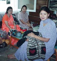ウールンガーデンはマティナさん(29才)という女性が14年前に始めた。その頃彼女は世界銀行が資金を出してイギリスから専門家を招いて手編技術の講習会を開いた時に指導を受けた。その後仕事として取り組むようになり一緒に指導を受けた近所の女性達にも依頼しながら続け、仕事が増えるに従い兄弟姉妹も手伝い、役所を退職した父親も手伝うようになり発展してきた。今では140人ほどの編み手を抱え店もカトマンズとパタンに2店営業するまでになった。編み手の女性達はそれぞれの家で家事、育児の合間に仕事をし、パタンの店の2階、3階の小さな工場では新しいデザインを指導したり、ウールを染めて糸を配分したり、ボタン付けや仕上げ検品など最終行程をしている。
