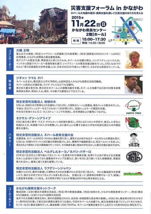 11/22(日)「災害支援フォーラム in かながわ ~ ネパール大地震の復旧・復興支援を通して災害支援のあり方を考える」(2015.11.20)