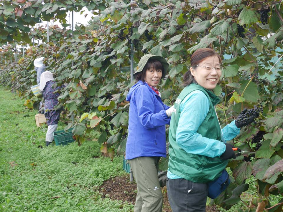 山葡萄収穫の、ツアー参加者の皆さんの楽しそうな笑顔をご覧ください (^^) (2016.10.12)