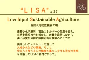 沖縄でのカカオ栽培や各地でのカカオ製品作りを通し、沖縄に新たな産業を創美味しいチョコレートを通して大地や水などの環境、そして作る人と食べる人の健康と暮らしを守る社会の実現を目指してLISAと名付けました。