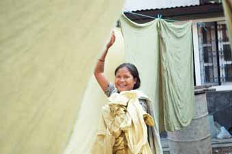 ラクシュミさんは、首都カトマンズ郊外のハルチョーク村で育ちました。貧しく荒み、女性が家の外に出て働くなどということは考えられない因習的な村でした。10歳の頃、村の男性たちの反対を押し切って行なわれた、マヌシの縫製トレーニングを受けました。修了後マヌシで働き始めるようになり、絞りと染色を担当しています。水を吸って重い布を休まずかき混ぜ、何度も絞らなければならない草木染めは、想像以上に力のいる仕事ですが、ラクシュミさんはいつも笑顔でみんなをまとめています。
