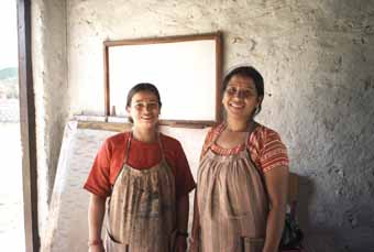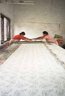 2007年1月。1年後の発表に向けて新しいプリントデザインをオーダーしました。それ以来、より良いプリントができるように、アシスタントのラクシュミさんと2人で、試行錯誤しながら頑張ってきました。今は2人でプリントをしていますが、近い将来、シャラダさんが、たくさんの女性たちを引っ張りながら、活気溢れる雰囲気の中、色鮮やかなプリントをしている様子が目に浮かびます。