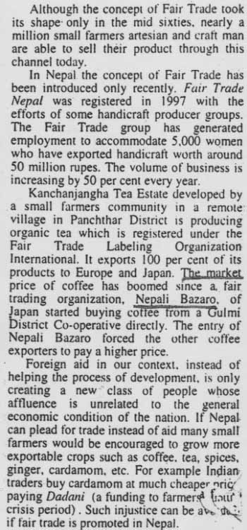 「繁栄と持続」と題して、フェアトレードの役割と期待に関する記事がネパールの新聞、THE RISING NEPAL(1999年10月15日)に掲載されました。