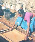 パルプを何度も洗い、最後に一定量を水に浮かばせた枠に薄く広げ紙漉き作業になる。日に干して数時間後、ロクタの紙は枠からはがされる。