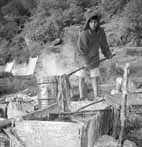 山の中では、時々タバコと飲み物で休みを取り、その間に他の生活に役立つ植物も探します。彼らは冗談を言い合い笑い合って仕事をし、午後遅くなってロクタの皮を大きな束にします。また枝も束ねます。枝はたきぎになります。数日後、皮を剥き乾かしたロクタを紙作りができる山小屋まで運びます。そこで、暖かく日当たりの良い場所を使って紙作りをします。薪をくべ、大きな銅の煮鍋をセットします。樹皮を灰注)で煮て、繊維を柔らかくし、余計な有機物を取り除きます。